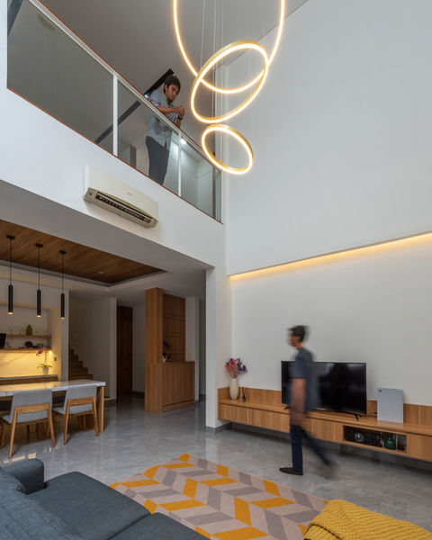 Dalam desain rumah ini, kami mengadopsi palet warna abu tua, putih, dan coklat kayu jati. Kombinasi warna ini menciptakan suasana nyaman dan hangat di dalam rumah. Kami menekankan privasi dengan sentuhan kesederhanaan.